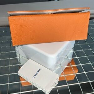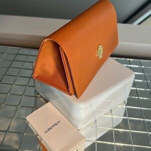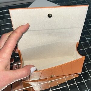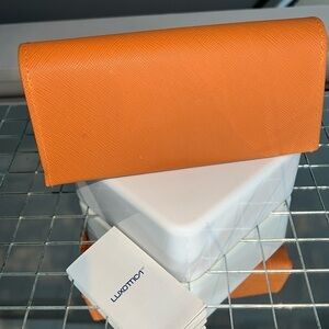 This is a beautiful New Tory Burch Crossgrain Orange Leather Large Sunglasses Case Clutch. Goldtone logo. Cream velvet interior very clean lightly padded. No odors, no tears. 6.5” x 2.5” x 3”H