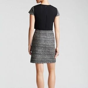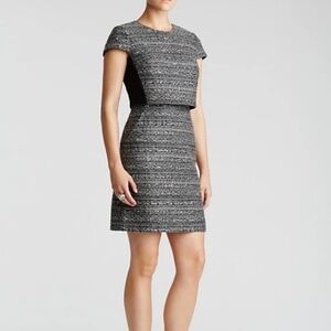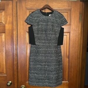 Tory Burch Deandra Mock Two Piece Dress in Granite in size 4. This Tory Burch silvery metallic dress offers a fresh spin on uptown tweed. A layered top gives the polished look of separates to this mini dress tailored from tweed and updated with a striped effect weave and subtle metallic gleam. Sparkling metallic fibers illuminate the rich eyelash tweed of this faux two piece dress fashioned with an unexpected color blocked panel at the back bodice. In excellent used condition.