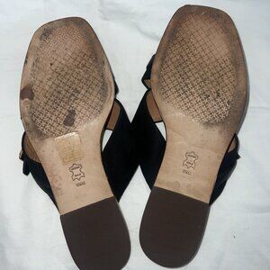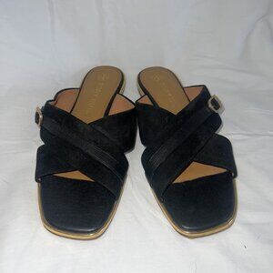 Tory Burch Delaney Flat Slide Sandals, Black Suede and Gold, Leather, Size 8.5