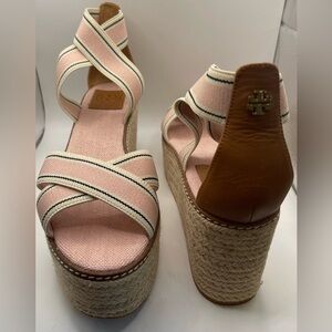 Tory Burch logo heels. wedding guest approved in pink, white, black, NWOT … these shoes have NOT been worn outside. The back has a soft suede leather for the protection of your heel and comfort. These are approx 3 inch high platform wedge sandals. Perfect if you’re a wedding guest, love designer, or you’re just a fun girl who loves heels. Has adjustable stretch for comfort and fit available in a size 9 I DO NOT have the box. Ships from a smoke free home.