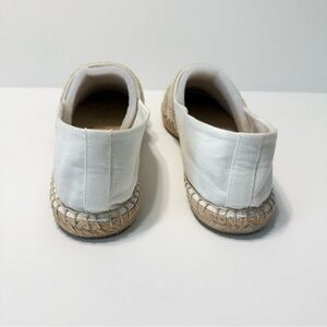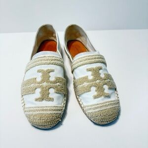 Tory Buch espadrilles, double T style,flat slip-on,chic white and tan color, they offer both comfort and sophistication. Perfect for any casual outing. Excellent preowned condition gently used ( some light dust, minor signs of wear ) Size: 10 M Textile upper Textile/Leather lining Rubber outsole Measurements insole/outsole approximately Ship same/next day Offers welcome