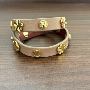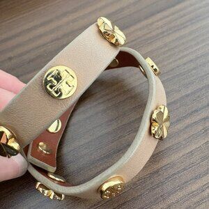 A signature Tory Burch double-wrap bracelet crafted in soft taupe leather with gold-tone logo and flower studs. The iconic TB medallions add a subtle shine while the wrap design layers effortlessly with other pieces or stands alone for a minimalist statement. Features adjustable snap closures and a supple leather finish. Note: minor wear near one hole (see photo).