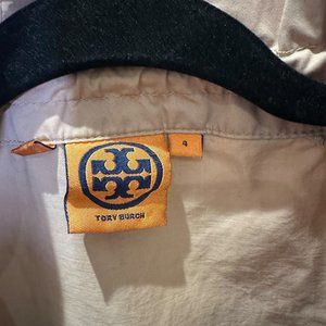 This Tory Burch Dress is a stylish, khaki tan mini dress for women. Designed with a snap front and drawstring, it's a size 4, made from 100% cotton.