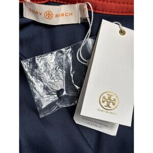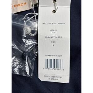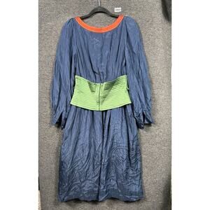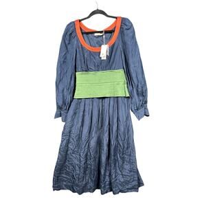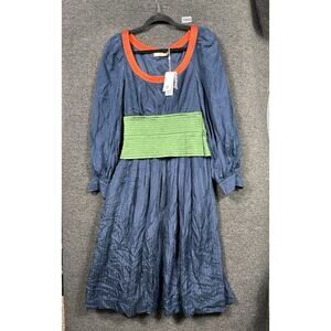 Tory Burch Dress Womens 8 Navy Blue Green Tie Waist Silk Pleated Midi Long Sleeve