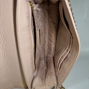 Dusty pink color with gold hardware and accents- excellent condition- no scratches, rips or tears- very very small spot on piping along bottom of front flap - retails for $500+- includes original dust bag