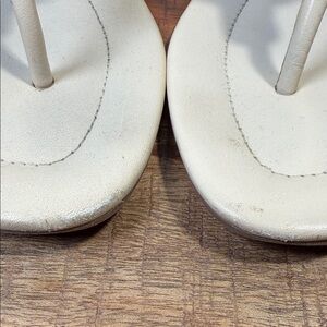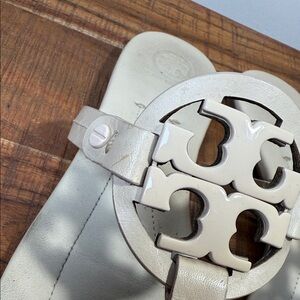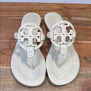 Chic Tory Burch sandals with signature logo design. Versatile ivory color. Ideal for any occasion.