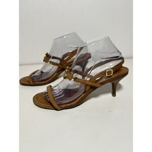 You are bidding on a pair of Mira 70mm sandals from Tory Burch, size 8.5 US women, tan leather, excellent condition. Adjustable buckle strap at ankle, gold tone logo, 2.75" heel. All sales are final so please email with questions.