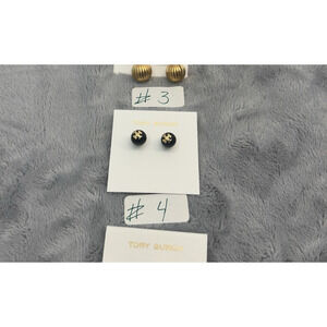These Tory Burch earrings feature black pearls with a double-T logo in gold studs. The round-shaped studs have a butterfly closure and are perfect for adding a touch of elegance to any outfit. The combination of the classic black pearls with the designer brand's signature double-T logo makes these earrings a stylish and sophisticated choice for fashion-forward individuals