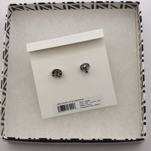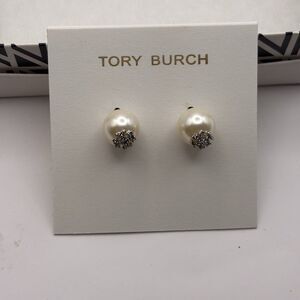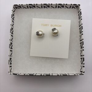 Tory Burch Earrings Kira Pearl Stud Pearl Silver Crystal Dobule T Logo Designer