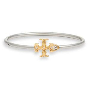 Tory Burch Eleanor Hinged Cuff Bracelet in Tory Gold / Tory Silver (Brand New) Add some of Tory's inimitable style to your wrist stack with this polished hinge cuff with an iconic double-T logo. 6 1/2" inner circumference; 1/2"W x 3/4"L setting Hinged hook and loop closure Goldtone/silvertone plate Imported Brand new Includes dust bag
