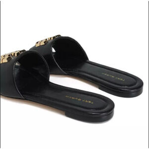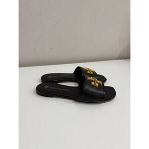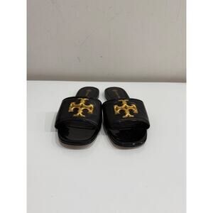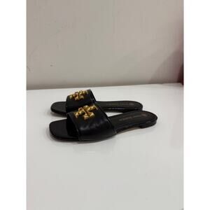 Tory Burch Eleanor Leather Slip On Flat Slide Sandal with Gold Logo Black US 6.5