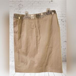 This stylish tan skirt features a chic sequin detail at the waist, perfect for adding a touch of sparkle to your outfit. Ideal for both casual and formal occasions. I loved this skirt when I could wear it! So flattering and expensive looking. This is more of a pencil skirt, no pockets, kick pleats on both knees, side zipper. The waist has jewels that are referred to as "sequins" but they are thicker and larger. These sequins look like abalone shells. Beautiful! This skirt is in EUC.