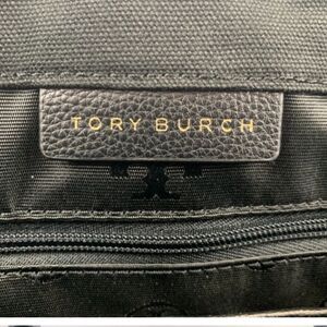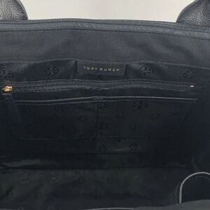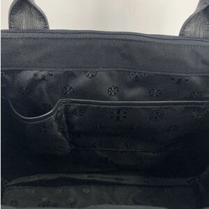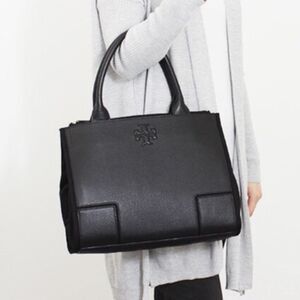 A Tory Burch tote crafted in pebbled leather with canvas side panels and a fully lined interior. This Tory Burch tote features a main open pocket with an interior zip pocket, two interior slip pockets, and two additional zip pockets; two rolled leather handles with an 8" drop. Dimensions: 12.15" x 15.74" x 6.18".