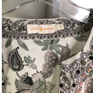 Tory Burch Embellished Botanical Print Tunic Blouse Size 2 Cream Deep V-Neck