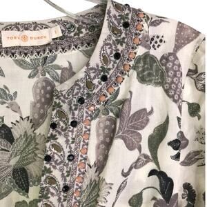 Tory Burch Embellished Botanical Print Tunic Blouse Size 2 Cream Deep V-Neck 52151135