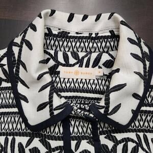 Tory Burch Embroidered Jacket in great pre-loved condition! Intricate vine print with snap button front and expandable zipper back. Minor makeup transfer on the collar as photographed.