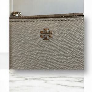 This Tory Burch Emerson wallet showcases a luxurious tan leather design with a subtly textured surface, offering both style and sophistication. Its compact rectangular shape is perfect for organizing essentials, while the metallic logo adds a touch of elegance. Ideal for those who appreciate refined accessories.