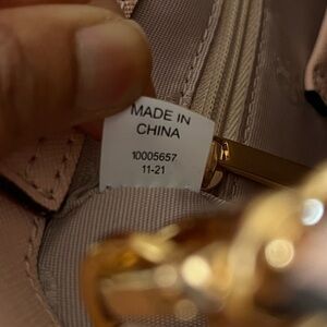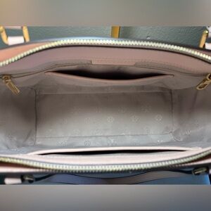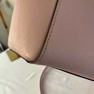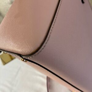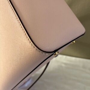 Elegant rose pink tote with dual handles. Features a detachable strap. Iconic Tory Burch logo accent.