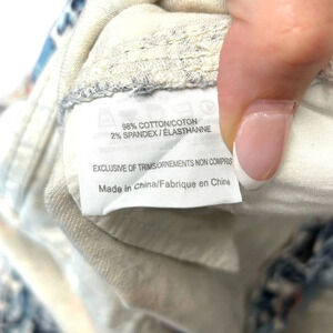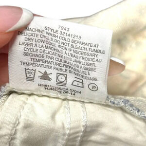 Tory Burch "Emmy Ankle" Length style Skinny Jeans in "Blue Lake Kyoto" color, super cute floral and butterfly pattern in blue and pink, printed on white cotton denim. Traditional 5 Pocket styling. Slits at the ankle with 4 snaps are an unexpected detail.