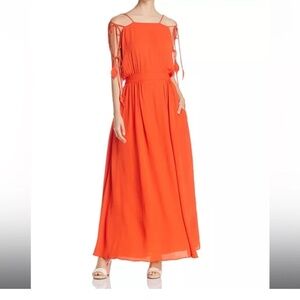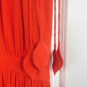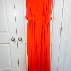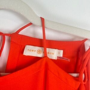 Check out this gorgeous dress made by Tory Burch. This is a size 8, it's crepe made from 100% Viscose. It's a long style with leaf tipped ties on the shoulders, sides, & back. It has a zipper & 2 snaps on the back waist for closure, it's lined. This is a solid Poppy Red-Orange shade & it is ankle length. Excellent condition, free of defects or stains, worn once for several hours. From a Smoke-Free & Pet-Free home! MEASUREMENTS: Bust- 38" Waist- 30" Hips- 46" Total Length- 58"