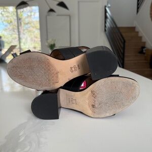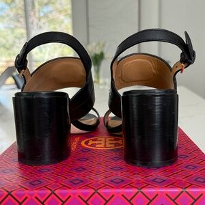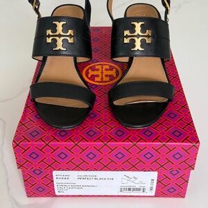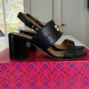 Luxe black calf leather sandals with signature gold Tory Burch logo. Comfortable mid-heel height and elegant silhouette. These come with their original box and dust bag.