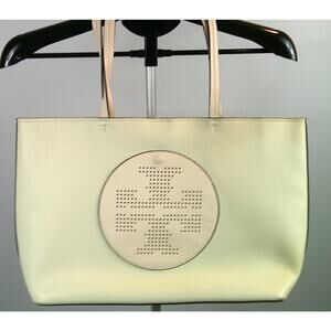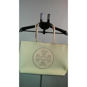 Elevate your everyday style with this chic Tory Burch Everyday Tote! This spacious tote features a beautiful cream and green color combination, perfect for adding a touch of sophistication to any outfit.