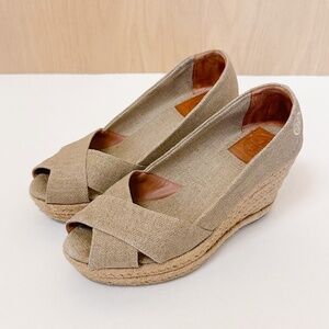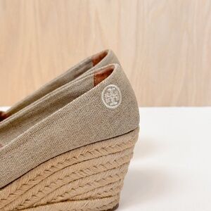 Tory Burch Filipa Linen Espadrille Peep Toe Wedge Heels. These classic espadrille wedges feature a neutral linen upper with crisscross straps across the toe and woven jute wedge heels. The embroidered Tory Burch logo detail on the back adds a subtle designer touch. Perfect for summer outfits, casual lunches, or vacations.