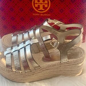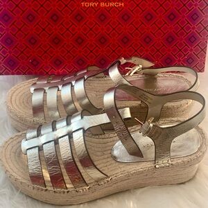 New never been worn except for try ons around the house, Tory Burch Fisherman Espadrille Wedge 75mm Metallic Leather