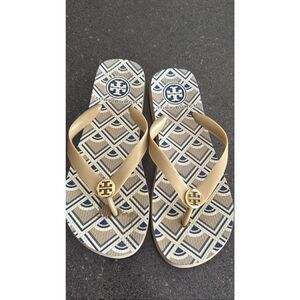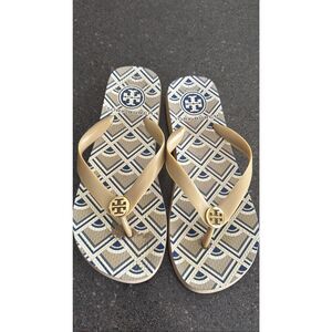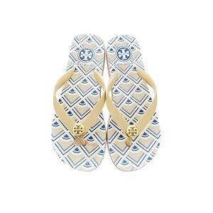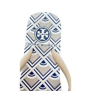 Tory Burch Elevate your shoe game Mini Minnie Flat Flip Flop - Firefly - Blue/tan size 8 Designed with a soft rubber thong-strap that features the label's logo emblem, and a stack of monochrome stripes to create a cushioned footbed.