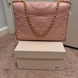 Medium, soft pink Tory Burch Fleming bag with gold accents