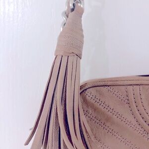 Chic beige crossbody with quilted design. Features chain strap and tassel detail. Perfect for versatile styling. Perfect neutral bag and great size. Beautiful condition but there are a couple of light marks on the back side likely transfer from denim. See pics. Two pockets and one zip pocket inside. Back pocket with magnet close. Length 22 cm. Width 6 cm. Height 15 cm. Shoulder strap 55 cm adjustable. Purchased at Bloomingdale’s. Sorry they did not provide a dust bag.