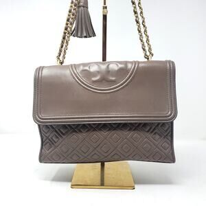 Tory Burch Fleming Convertible Shoulder Bag Crossbody Leather Gray Taupe
