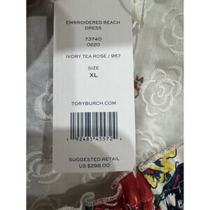 Envision yourself in this stunning Tory Burch dress, where intricate embroidery dances across a lightweight, airy canvas. The delicate floral pattern, with its rich red, blue, and green hues, adds a touch of whimsy, while the tiered silhouette creates a flattering and feminine shape. With its peasant-style neckline, the dress radiates relaxed elegance. A charming tie detail at the neckline adds a touch of personalization. Perfect for a garden party, a casual brunch, or a romantic evening stroll, this dress exudes effortless style.