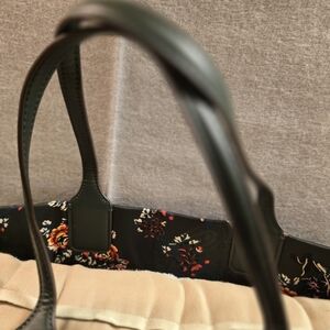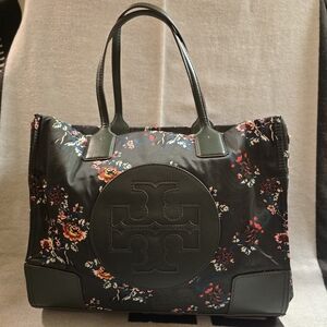 excellent condition, nylon leather tote bag by Tory Burch. A few scratches at bottom leather big hardly can see. Inside is clean with one open pocket and zippered pocket. The color of this bag is army green