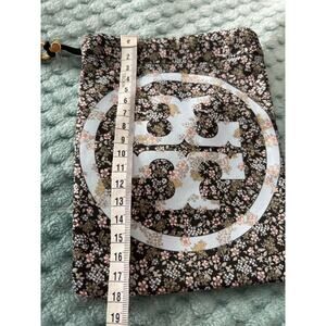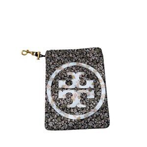 Authentic Tory Burch wristlet pouch featuring a black multi-color floral print and signature logo. Includes gold-tone clip for attaching to bags or keys. Compact and stylish for carrying essentials.