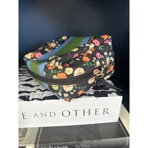 Charming Tory Burch makeup bag featuring a bold floral print with vibrant orange, yellow, and pink blossoms set against a deep chocolate background. Accented by a striking green and periwinkle blue center stripe and the signature Tory Burch medallion logo. Spacious interior with wipeable lining and gold-tone zipper closure. Perfect for travel, daily beauty essentials, or as a stylish clutch alternative.