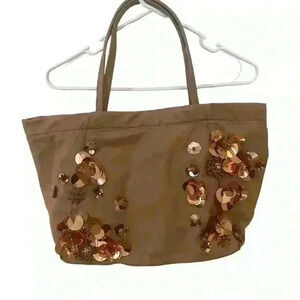A classic shape, transformed: the flower cluster tote features blossoms of faceted beads, stones and petals made of paillettes, giving the casual everyday style evening wearability. A resilient nylon body, roomy interior and plenty of pockets for keeping essentials organized make the design practical, while the detailed embellishment and saffiano leather straps. Style# 41139707. MSRP $350.