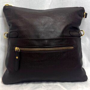 • convertible, adjustable strap, shoulder bag, crossbody bag, full bag, foldover bag, zipper compartments, zip closure, gold logo, designer bag, leather bag, brown leather bag, flap top bag, foldover bag,