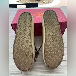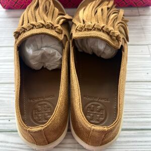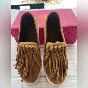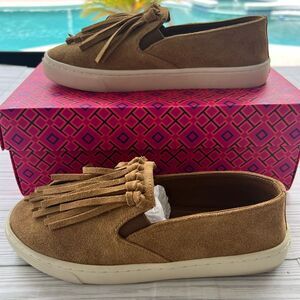 Chic Tory Burch sneakers with suede fringe. Slip-on style for easy wear. Perfect for casual looks. In box, used once