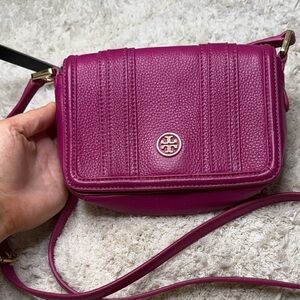 Stylish Tory Burch crossbody in vibrant fuchsia. Perfect for adding flair to any outfit.