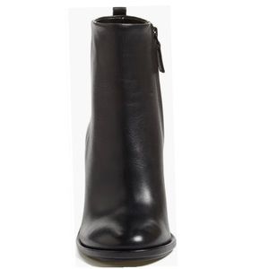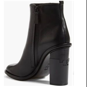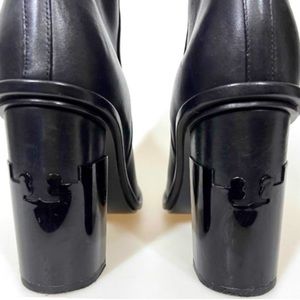 A cutout logo emblem brands the tall block heel of a sleek leather bootie styled with a classic almond toe and subtle architectural detailing for a simple and structured look.
