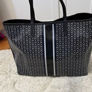 Elegant Tory Burch tote with a striking black and white pattern. Perfect for daily essentials.