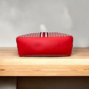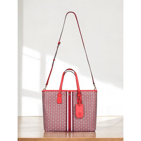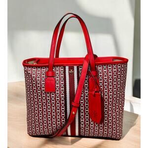 This Tory Burch Gemini Link Canvas Small Tote Shoulder Bag is such a great style and color. Featuring coated canvas with a Gemini Link design in Liberty Red with red leather trim and a removable/adjustable strap for tote, crossbody, or shoulder wear. The perfect, versatile and stylish bag for everyday use. If you love Tory Burch, then this is a must have for your collection!