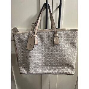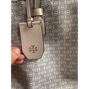 This Tory Burch tote showcases a Gemini Link pattern in a chic beige and blue palette. Unused and without tags, it offers a spacious interior for essentials. A slight stain is present, and it lacks the long strap. Ideal for work or travel, offering both style and practicality.