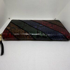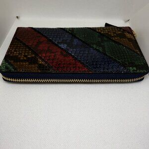 Elevate your style with this stunning Tory Burch zip-around wallet, crafted in a luxe embossed snakeskin-style leather with bold multicolor diagonal stripes. The Gemini Link design is both modern and timeless, making it the perfect statement accessory.