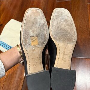 These Tory Burch flats feature a sleek black leather design accented by a striking gold square buckle. The elegant and timeless style makes them perfect for both professional and casual settings, offering comfort without compromising on sophistication.