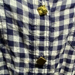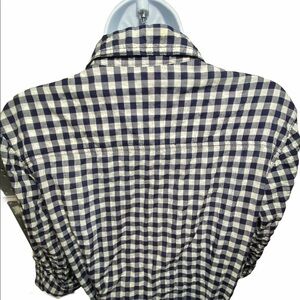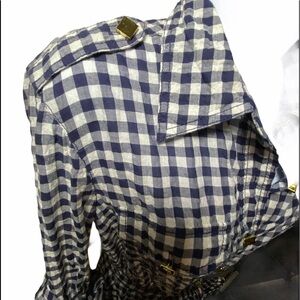 Tory Burch gingham dress circa 2012. Includes self tie belt. Epaulet at shoulders. Sleeves can be rolled up and secured with button tabs. Navy and white gingham, a signature Tory Burch piece. In excellent pre-owned condition comes from a smoke free home, no rips or stains.