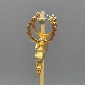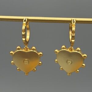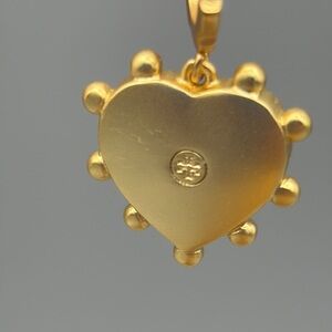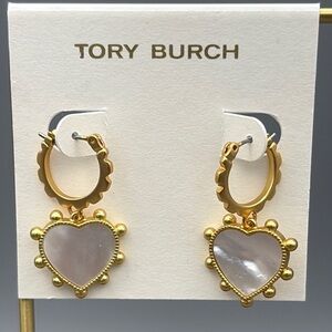These elegant Tory Burch earrings feature gold-tone hoops with heart-shaped pendants in a soft white, mother of pearl. The pendants are beautifully set in a gold frame, adding a touch of sophistication to any ensemble.