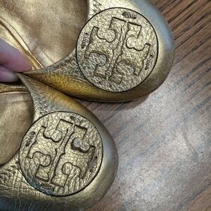 Tory Burch Gold Metallic Leather Ballet Flats. I believe these are the Reva Ballerina. Size is worn off, measure similar to a 7, which matches my personal fit as I'm a 7.5-8 and these are just a little snug.