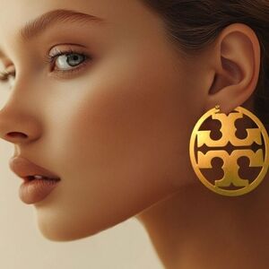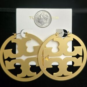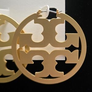 Elegant gold earrings featuring the iconic Tory Burch logo. Perfect for any occasion.